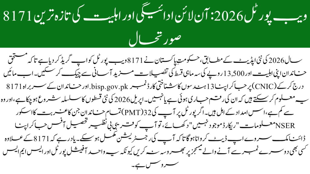 8171 ویب پورٹل 2026 پاکستان کی حکومت کی طرف سے بے نظیر انکم سپورٹ پروگرام (BISP) کے تحت شروع کیا گیا سرکاری آن لائن نظام ہے۔ اس پورٹل کے ذریعے، خاندان اپنا CNIC نمبر درج کرکے فوری طور پر اہلیت کی تصدیق کرسکتے ہیں، ادائیگیوں کی صورتحال دیکھ سکتے ہیں، اور اپنا اندراج چیک کر سکتے ہیں۔ سب سے اہم بات یہ ہے کہ یہ پورٹل مفت، محفوظ، اور گھر بیٹھے استعمال کے لیے دستیاب ہے۔ درست CNIC اور نفوس کے حوالے سے معلومات اپ ٹو ڈیٹ رکھنے سے پروگرام کے تحت مالی امداد تک آسان رسائی ممکن ہوتی ہے۔